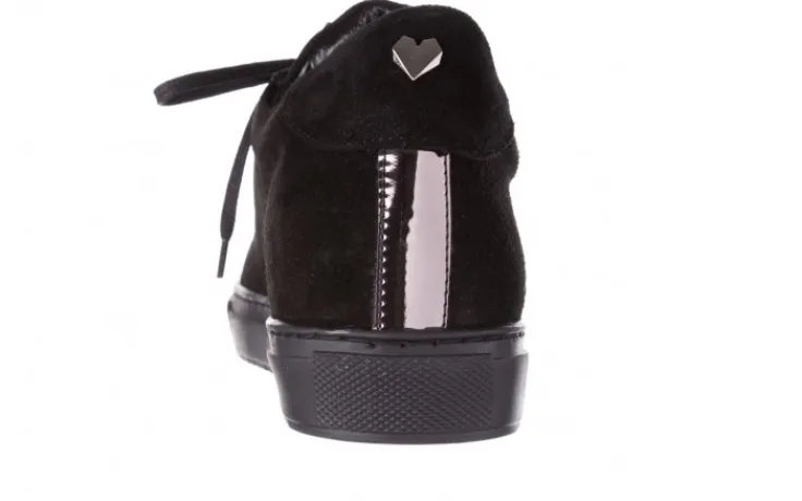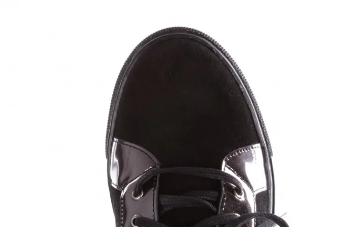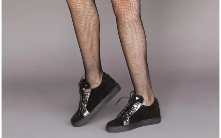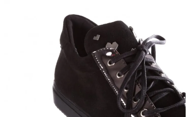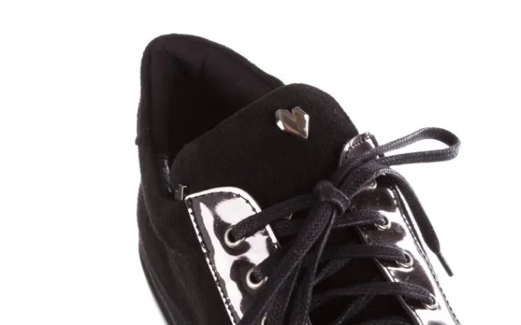 Wkładka i wyściółka wykonana ze skóry naturalnej w kolorze czarnym. Trampki na wygodnej antypoślizgowej 2,5 cm podeszwie. Z przodu sznurowane. Przednia część buta oraz pięta ozdobiona srebrnymi paskami skóry. Z tyłu buta metalowe serduszko.