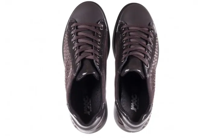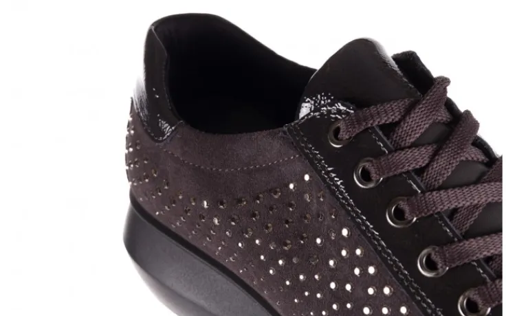 Wkładka wykonana ze skóry naturalnej, natomiast wyściółka z miękkiego materiału w kolorze czarnym. Trampki na wygodnym 4,5 -centymetrowym podwyższeniu. Podsówka na 2,5 cm podwyższeniu. Z przodu sznurowane. Z zewnętrznej strony cholewki znajdują się srebrne dżety. Tylna, górna część cholewki, czubek języka oraz wzdłuż języka skóra naturalna lakierowana.