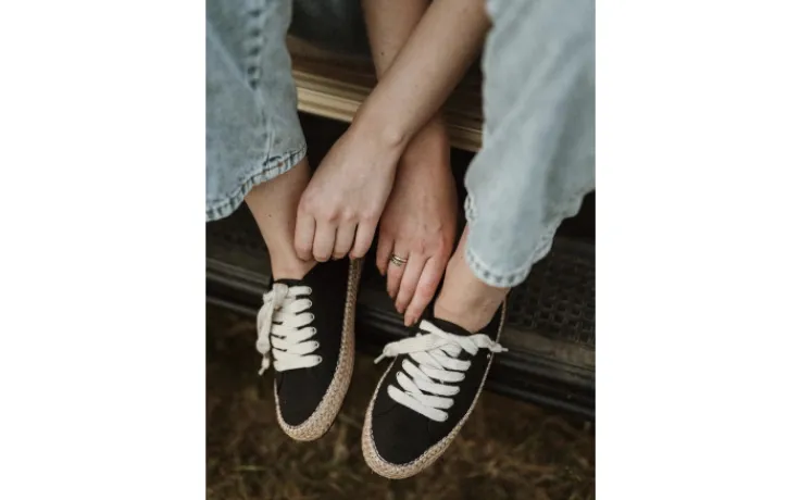 Buty w kolorze czarnym, trwała gumowa podeszwa z korkowym wykończeniem zapewniającym trakcję i przyczepność.
