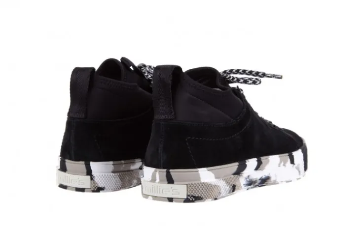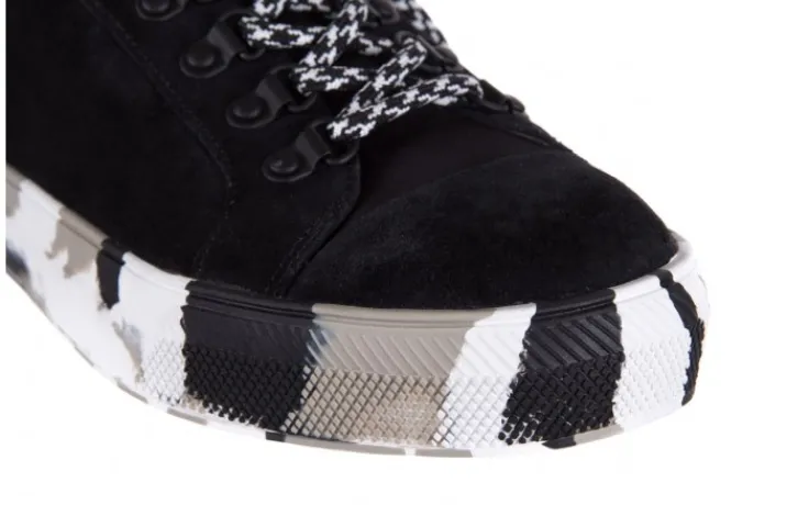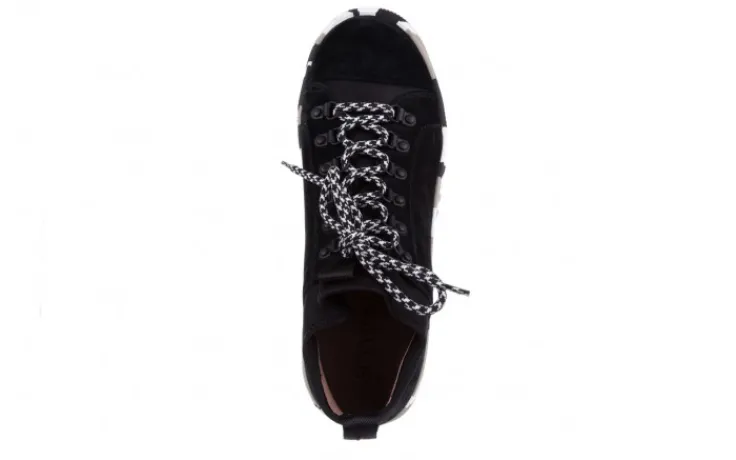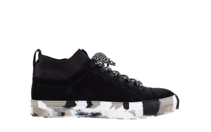 Trampki na platformie marki Sca’viola. Wykonane z miękkiej skóry zamszowej w kolorze czarnym. Z przodu sznurowane. Górna część cholewki to elastyczny materiał (neopren), który ułatwia zakładanie obuwia. Platforma wykonana z tworzywa o właściwościach antypoślizgowych, ozdobione modnym w tym sezonie wzorem moro. Idealne na co dzień.