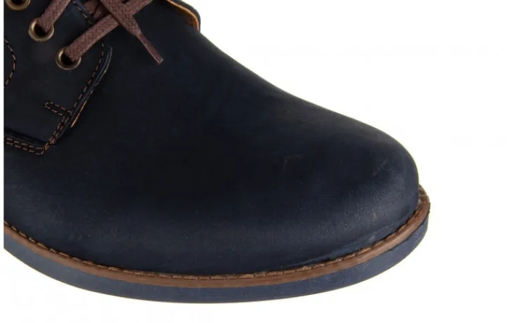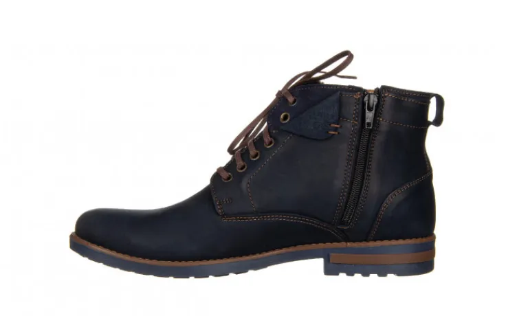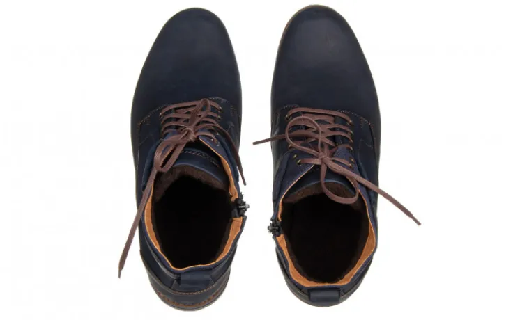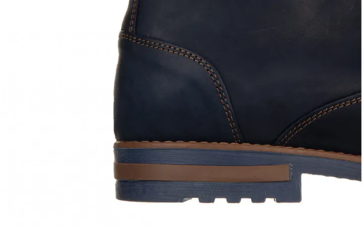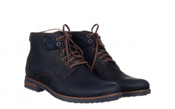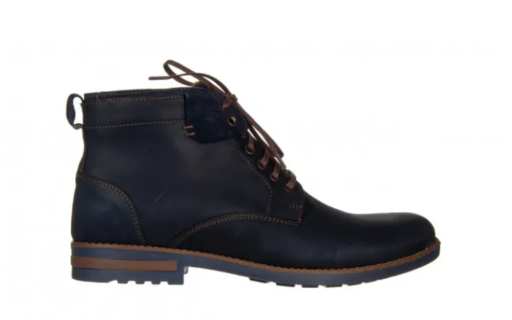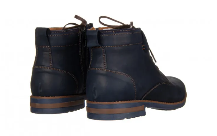 Wkładka oraz wyściółka materiałowa, co gwarantuje wygodę uzytkowania oraz delikatne ocieplenie. Sznurowane z przodu. Ozdobne przeszycia cholewki nicią w kolorze brązowym i podeszwa z utwardzanego tworzywa sztucznego również kolorze granatowo-brązowym. Buty będą idealnym uzupełnieniem codziennego wyglądu wpasowując się zarówno w sportowe jak i bardziej casualowe stylizacje.