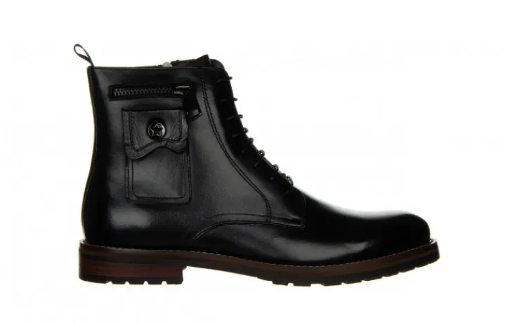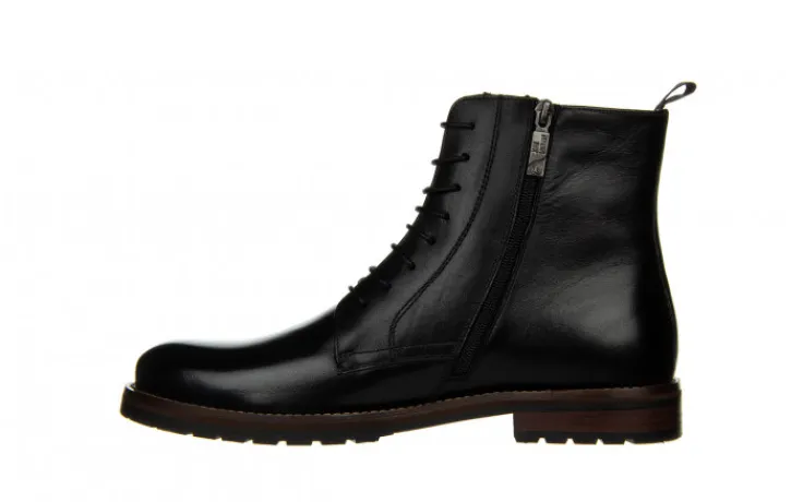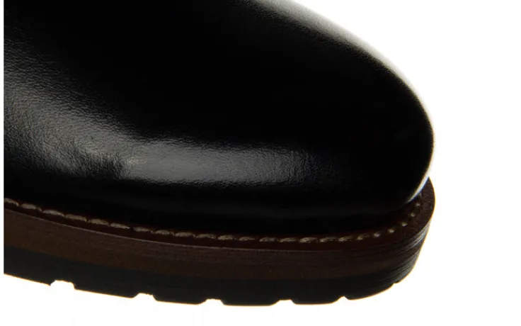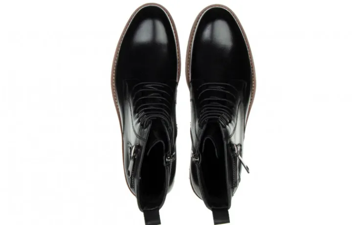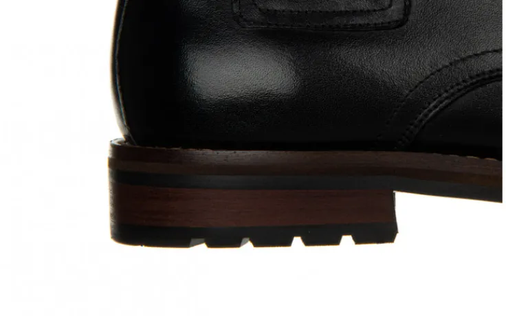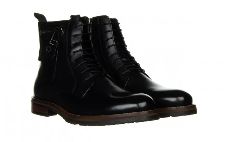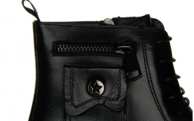 Oryginalne buty z wyższą cholewką wykonane z wysokogatunkowej skóry naturalnej. Dzięki sznurowaniom można idealnie dopasować buty do tęgości stopy, natomiast wygodny zamek od wewnętrznej strony ułatwia szybkie zakładanie i zdejmowanie obuwia bez konieczności ciągłego sznurowania. Atrakcyjności dodaje imitacja kieszonki oraz zasuwaka. Gumowa, antypoślizgowa podeszwa izoluje stopy od zimnego podłoża. Wkładka oraz wyściółka ocieplane. Buty sprawdzą się w zestawie z ciepłym płaszczem bądź kurtką. Uzupełnią też świetnie stylizację z ponadczasowymi jeansami albo ze spodniami o zwężanych nogawkach.