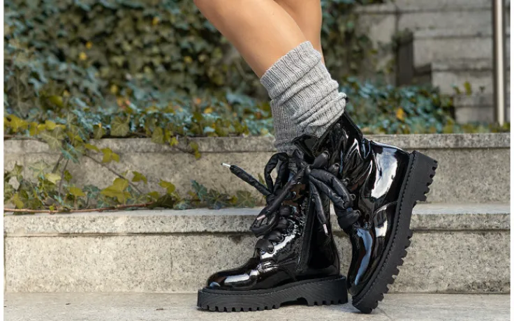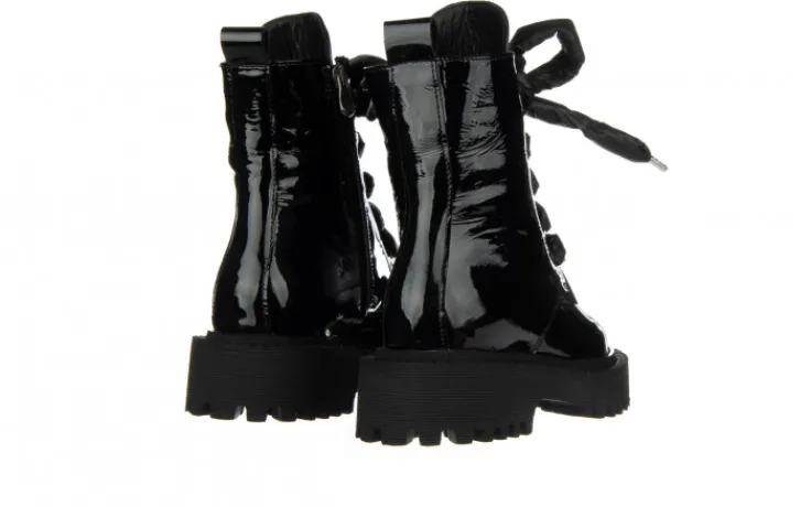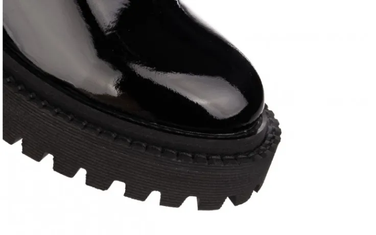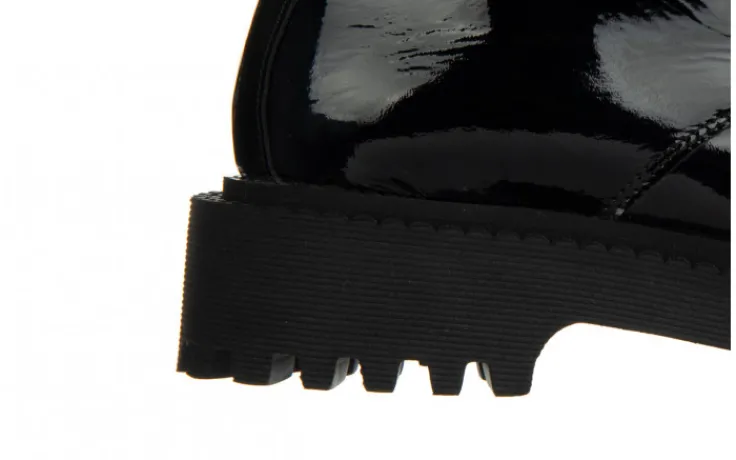 Wkładka oraz wyściółka delikatnie ocieplone w kolorze czarnym. Trzewiki na wygodnym 4,5-centymetrowym obcasie. Z przodu sznurowane, z boku zapinane na zamek. Buty wykonane z wysokiej jakości skóry naturalnej lakierowanej, komfortowe oraz niezwykle wygodne. Prosty fason doskonale sprawdzi się na jesień/ zimę 2021/22.