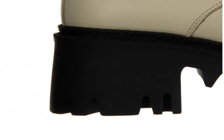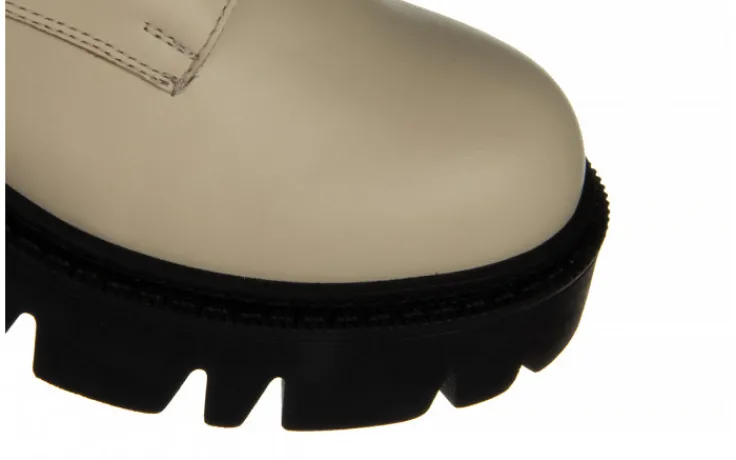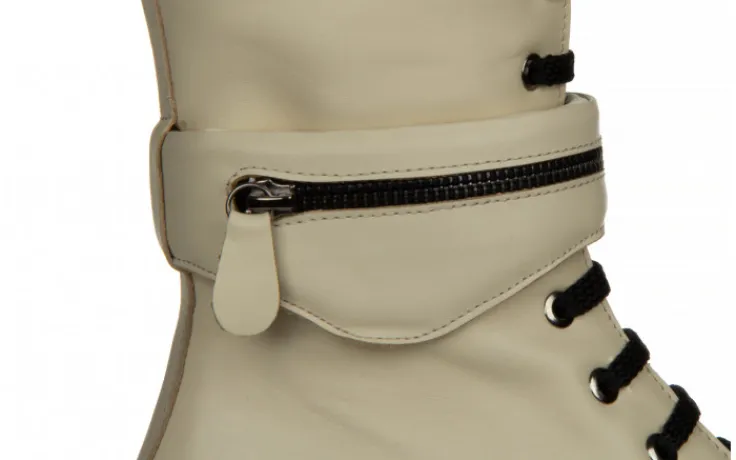 Wyższa cholewka wykonana jest z miękkiej skóry naturalnej wysokiej jakości. Dzięki sznurowaniom można idealnie dopasować buty do tęgości stopy, natomiast wygodny zamek z wewnętrznej strony ułatwia szybkie zakładanie i zdejmowanie obuwia bez konieczności ciągłego sznurowania. Nad kostką efektowna imitacja kieszonki na zasuwak. Antypoślizgowa, gumowa podeszwa z głębszym bieżnikiem amortyzuje wstrząsy oraz izoluje stopę od zimnego podłoża. Platforma dodaje centymetrów i przy tym sprawia, że buty stają się bardzo wygodne. Wkładka oraz cholewka ocieplana od wewnątrz.