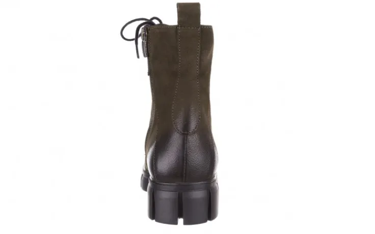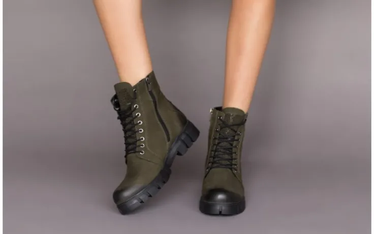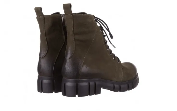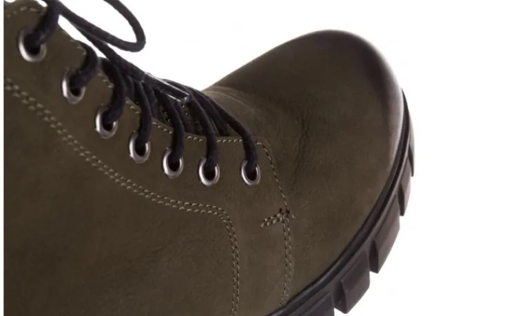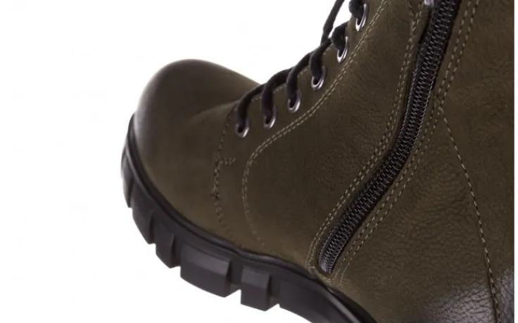 Wkładka oraz wyściółka delikatnie ocieplone w kolorze czarnym. Trzewiki na wygodnym 4-centymetrowym obcasie. Z przodu sznurowane, z boku zapinane na zamek.