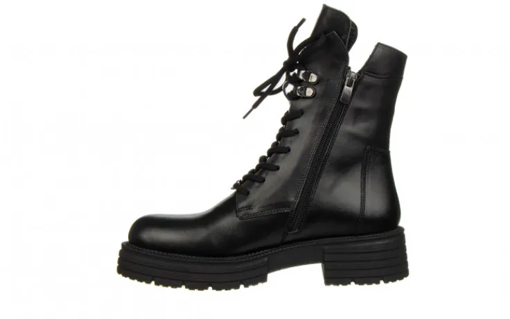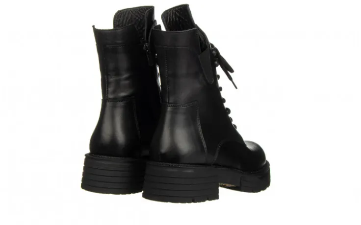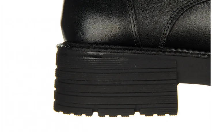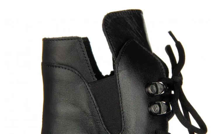 Trzewiki damskie sznurowane oraz zasuwane od wewnętrznej strony. Asymetryczna cholewka sięgająca za kostkę. Efektowna gumka z zewnętrznej strony. Gumowa, antypoślizgowa podeszwa amortyzuje wstrząsy oraz izoluje stopę od zimnego podłoża. Wnętrze w całości ocieplane. Klasyczny okrągły nosek