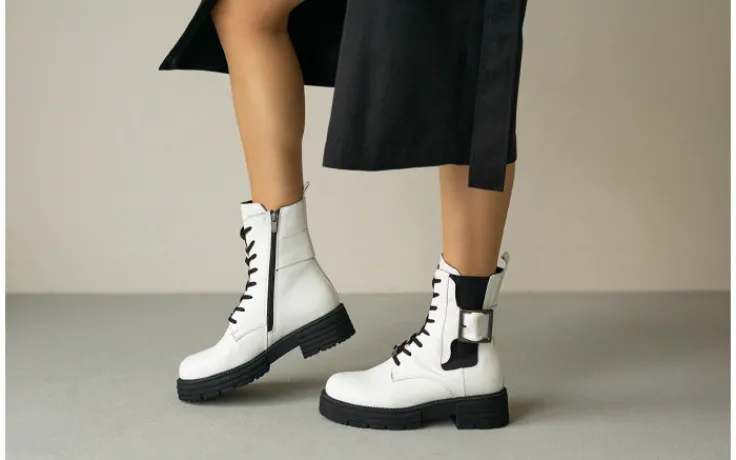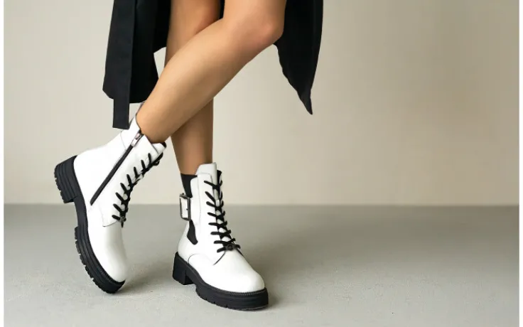 Trzewiki damskie sznurowane oraz zasuwane od wewnętrznej strony. Cholewka sięgająca za kostkę. Efektowna gumka z klamrą z zewnętrznej strony. Gumowa, antypoślizgowa podeszwa amortyzuje wstrząsy oraz izoluje stopę od zimnego podłoża. Wnętrze w całości ocieplane. Klasyczny okrągły nosek. Czarna podeszwa oraz sznurówki. Trzewiki Bayla świetnie łączą ze sobą rockowy styl z codzienną modą tworząc wyrazisty fason.